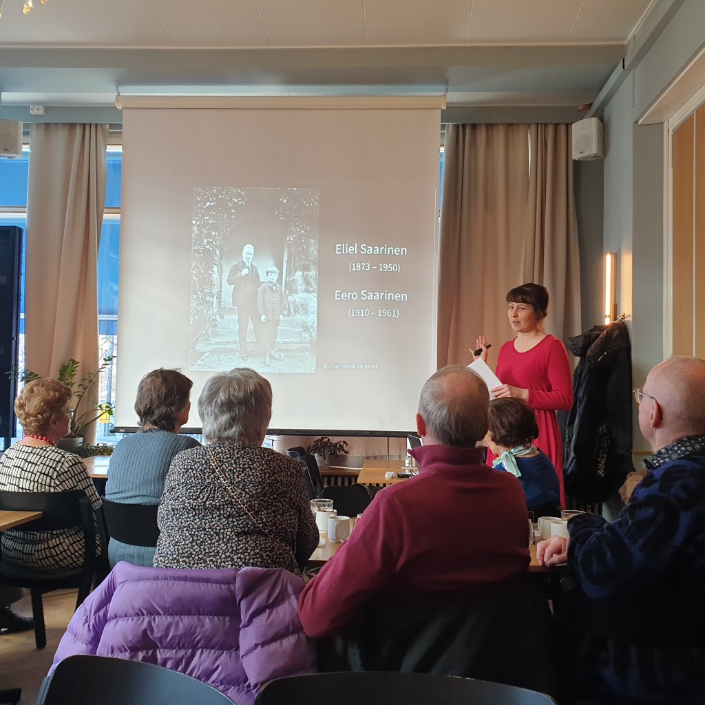 Kokouksen aluksi kuulimme FM Suvi Nuotion esitelmän Eliel Saarisen (1873–1950) Amerikan ajasta (1923–1950) sekä Eero Saarisen (1910–1961) arkkitehtuurista.