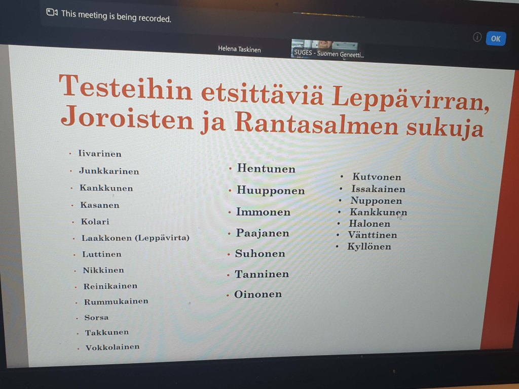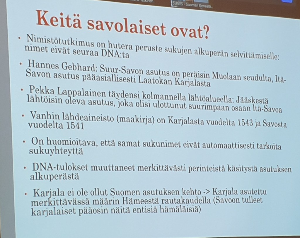 Seuran sääntömääräinen syyskokous pidettiin 21.11.2024 ravintola Arthurissa Helsingissä. Kokouksen aluksi juvalainen FM Ari Kolehmainen kertoi etäyhteydellä Savon asutushistoriaan liittyvistä tutkimuksistaan sekä isälinjaisten Y-DNA-testien tuomista mahdollisuuksista tutkittaessa säilyneitä kirjallisia lähteitä varhaisempia aikoja. Ari kertoi mielenkiintoisesti vanhoista savolaisista kantasuvuista, niiden alasuvuista sekä sukujen nimien vaihtumisista aikojen kuluessa. Ari valmistelee Jyväskylän yliopistoon väitöskirjaa Savon asutushistoriasta. Hänellä on käytössään noin 500 DNA-testiä, mutta useiden Savon sukujen geenipolku on vielä selvittämättä. Jos olet kiinnostunut sukusi testauksesta, niin ota yhteyttää Ariin (puh.numero 040-8306457, sähköpostiosoite kolehmainen.ari@gmail.com).
